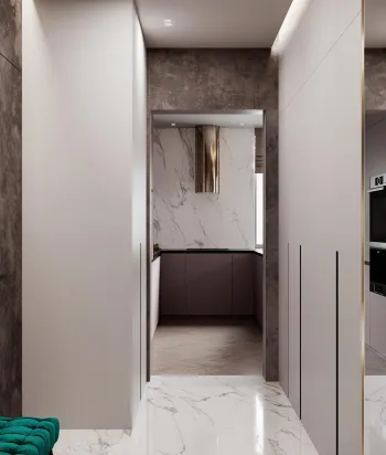 Роскошный мраморный холл в современном стиле с золотыми акцентами, проект «Зубово Лайф3»